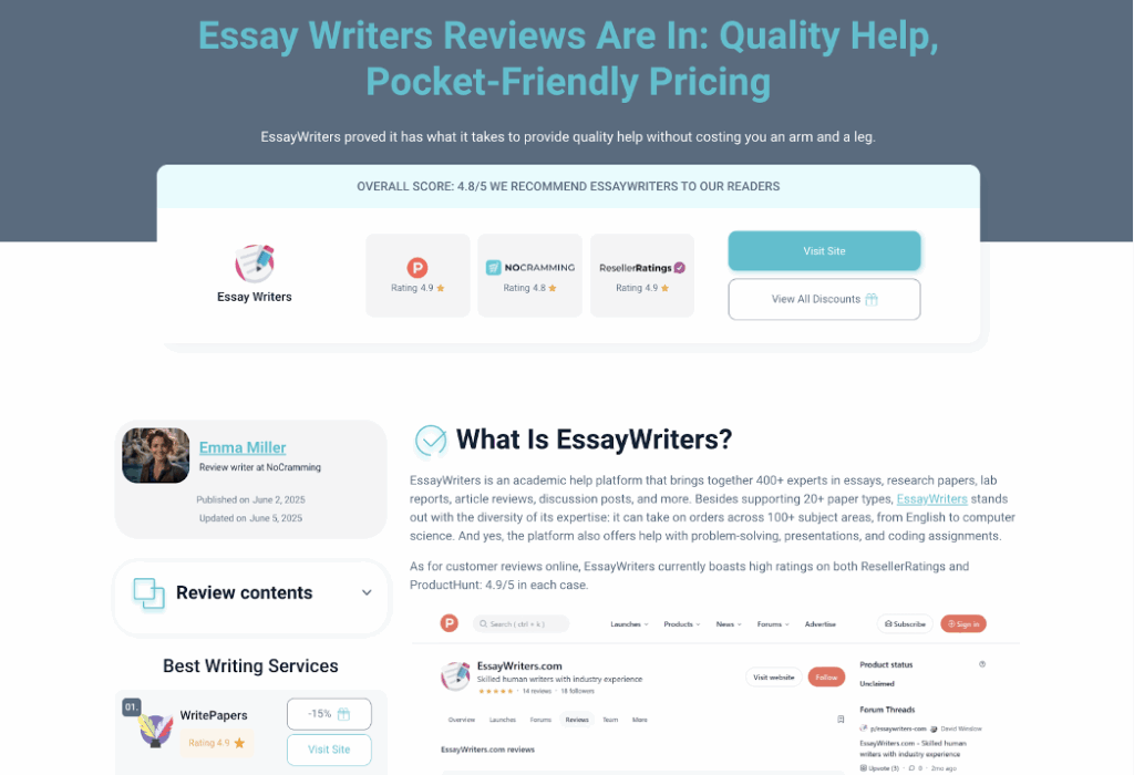 At NoCramming, we first wrote EssayWriters.com review when it earned a 4.8/5 rating based on affordability, transparent workflows, and solid content quality. A month later, instead of asking what changed, we’re digging into how it compares to new tools, evolving expectations, and the shifting definition of what makes the best essay writers in 2025.