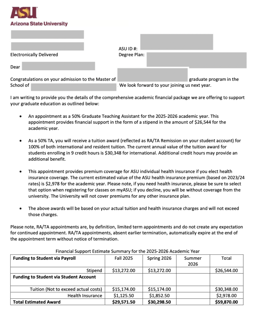 A standout example is a student who secured a 100% fully funded Master’s scholarship for a two-year program at Arizona State University (ASU). Here’s what his funding package included: